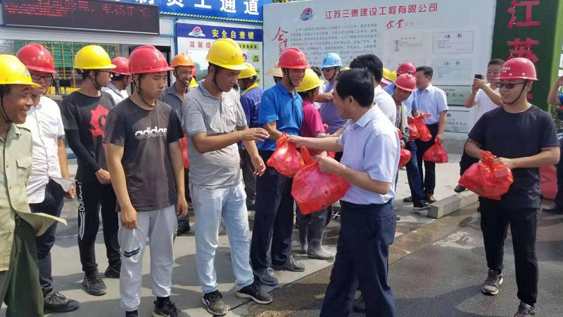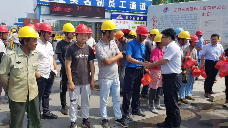 連日來,我市烈日當空,持續高溫,為改善夏季工作條件,對依舊堅持在烈日下工作的一線職工表達敬意和關懷,加強高溫期間職工勞動保護工作,推動企業落實防暑降溫措施,2019年8月7日上午,醫藥高新區組織部部長葛立網,住建局局長朱葉青、副局長洪一琤在華信公司董事長張由鳳、總經理楊鑌等一行的陪同下來到康澤花園一期、醫藥城小學項目現場,對現場工作人員進行高溫慰問,為這個炎熱的夏季送來清涼。